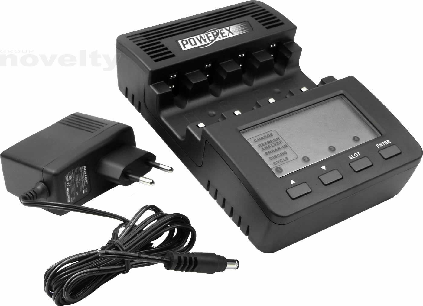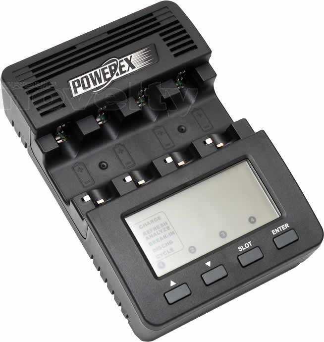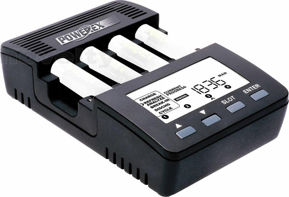 The MH-C9000 WizardOne Charger-Analyzer for 4 AA / AAA NiMH / NiCD Batteries from Powerex charges 1-4 AA or AAA NiMH or NiCD batteries via 4 independent slots. It supports batteries with capacities of 100-20,000mAh. The large, backlit LCD screen displays capacity, voltage, elapsed time and current. The charger provides 29 selectable charge and discharge rates, including 19 charging currents from 0.2-2.0A (200-2000mA) and 10 discharging currents from 0.1-1.0A (100-1000mA) in increments of 0.1A.