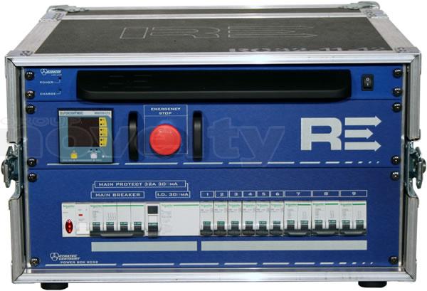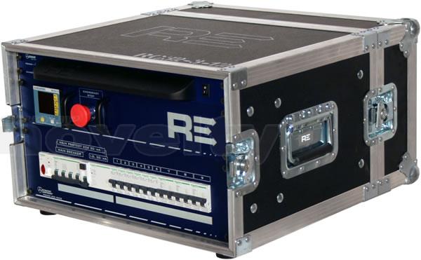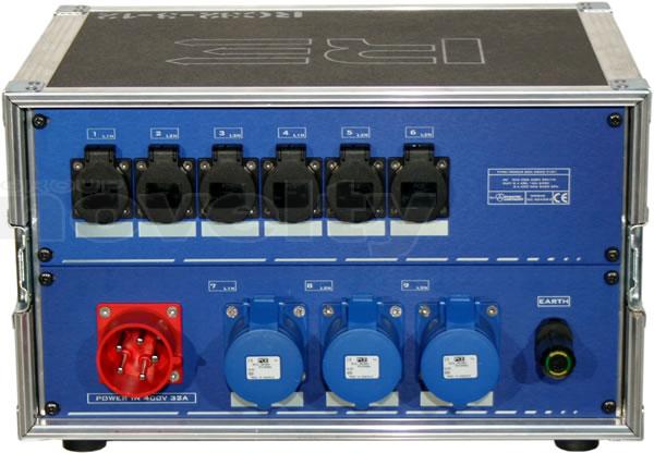 Armoire de distribution en flight-case. Entrée : P17 32A tri. Sorties : 3 x P17 32A mono + 6 x PC16A. Protection différentielle 30mA