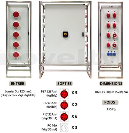 Armoire de distribution sur pied. Entrée : Bornier. Sorties : 5 x P17 125tri + 2 x P17 63tri + 6 x P17 32tri + 3 x PC16A. Protection différentielle 30mA. Dé-classable en 400A