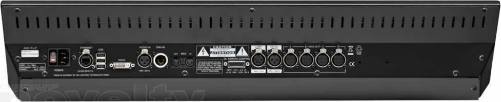 - 4 x XLR 5 (DMX), 3 x USB, 1x DVI-D, 1 x DIN (MIDI), 1 x XLR 4 (Eclairage pupitre)