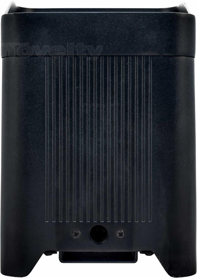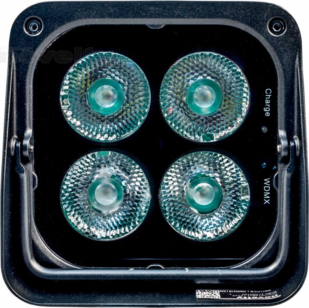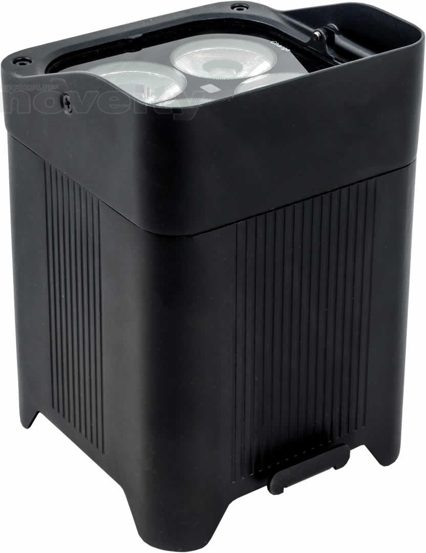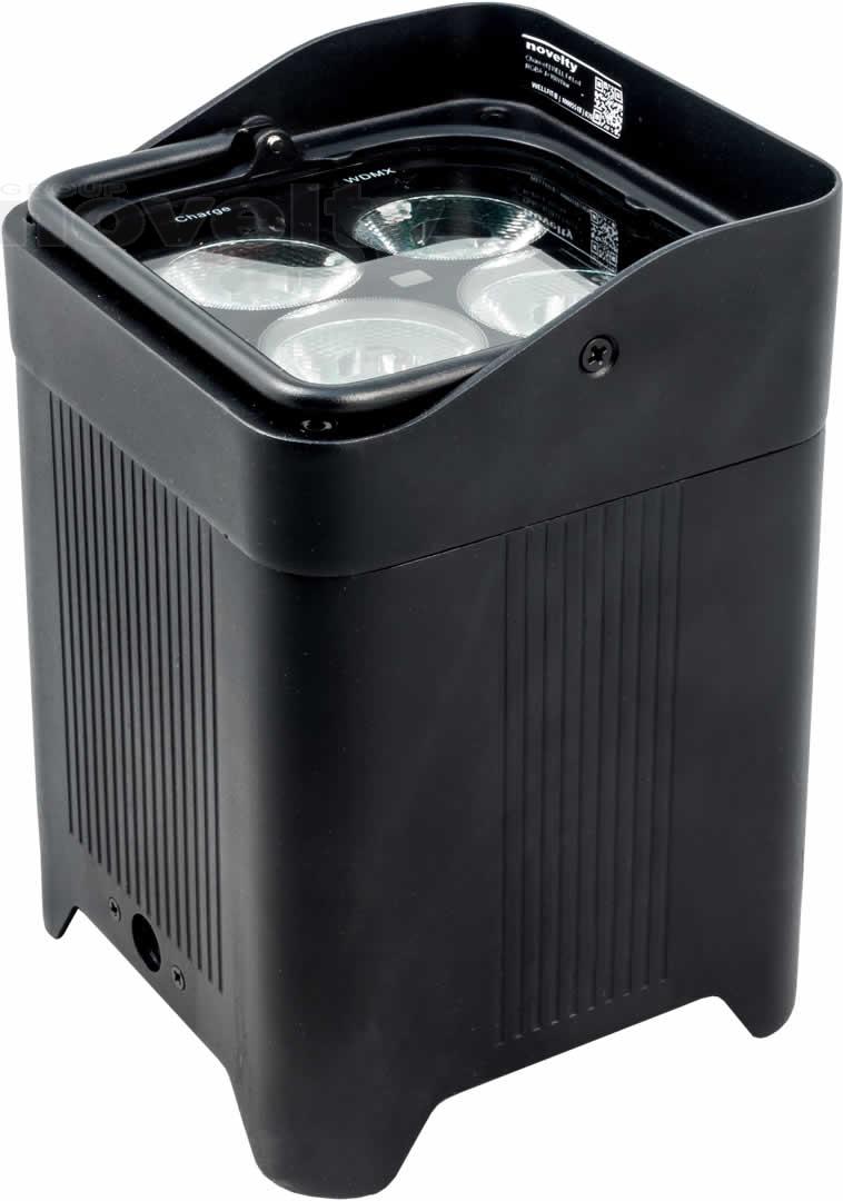 • A completely wireless IP65 rated battery powered up-light with four high powered quad colored RGBW LEDs that is controlled by W-DMX or IR remote.