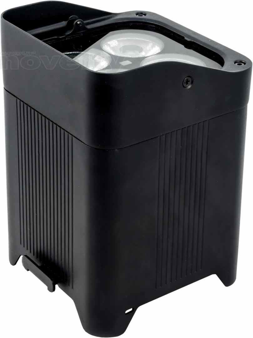 Projecteur LEDs noir (4xRGBW de 10W), ouverture 11-18°, sur batterie (autonomie 8 à 20h) pilotable via DMX, HF, pied inclinable