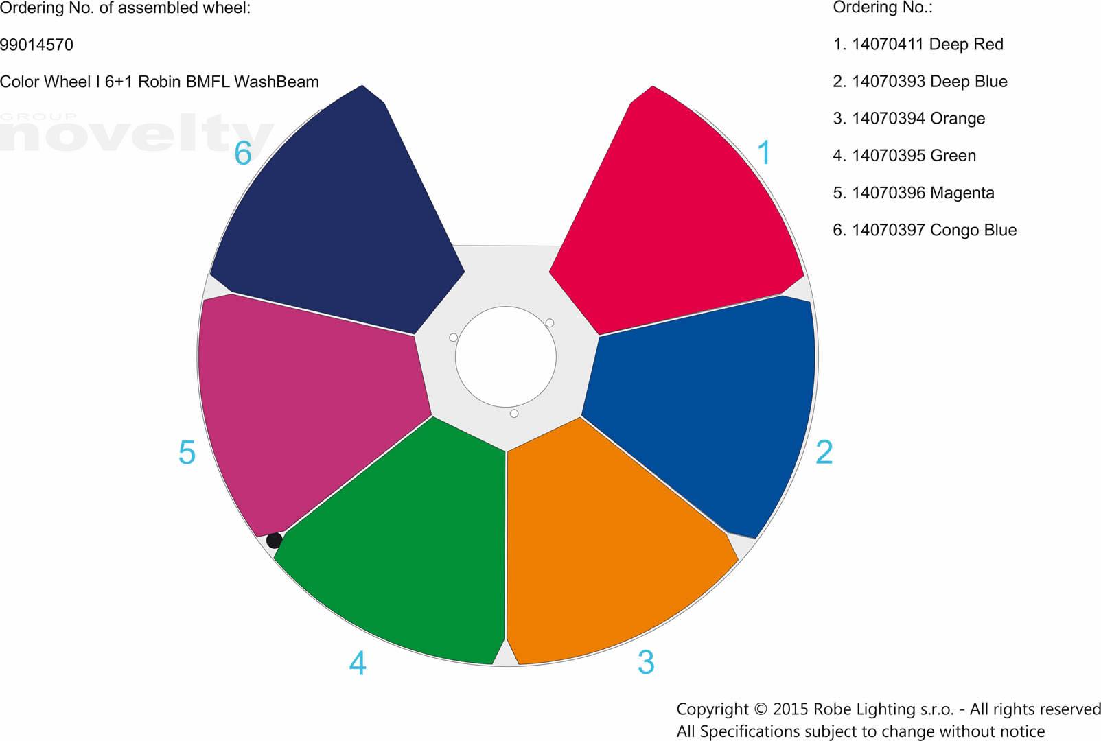 - Colour wheel 1: 6 fixed dichroic colours - deep red, deep blue, orange, green, magenta, congo blue + white