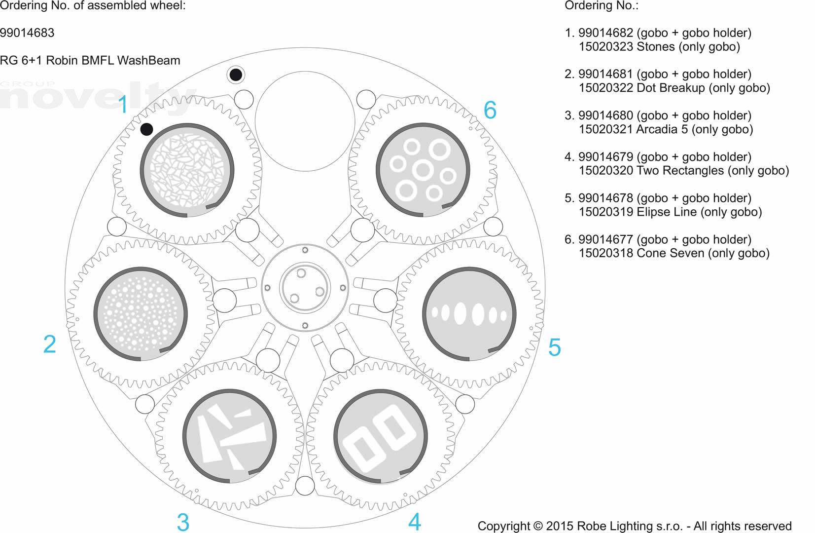 - Rotating gobo wheel: 6 rotating, indexable, replaceable "SLOT&LOCK" glass gobos + open