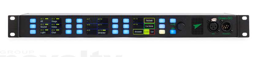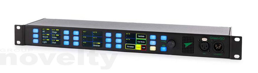 The Green-GO Multi-Channel Rack Station provides direct access to 32 separate users or groups through individual multicolour push-buttons. Each button can be assigned to a single user or a group. Three colour TFT touchscreens indicate the name, volume level and status of the channels. The push-buttons next to the touchscreens are used to control the operational features for each channel (‘Talk’, ‘Listen’, ‘Call’ or ‘Cue’ – depending on which function is selected).The Multi-Channel Rack Station has an internal loudspeaker. A 3-pin XLR microphone connector on the front panel allows you to connect a stalk microphone (not supplied). On the back panel are two Ethernet LAN ports with an internal 100MB switch. There is also a GPIO connection located on the back of the device (2x in, 2x out).