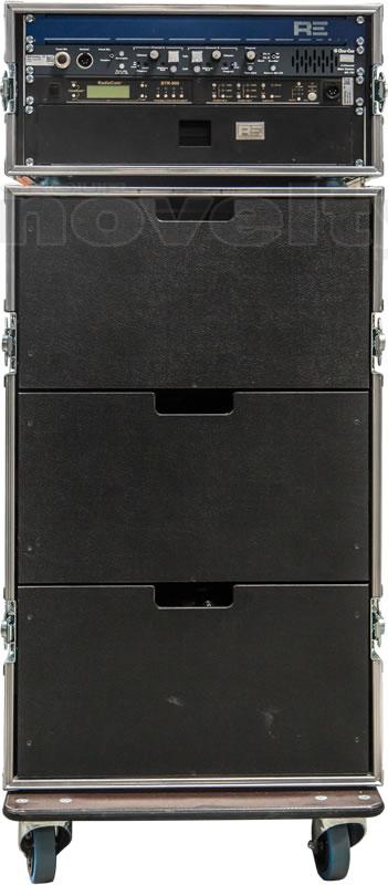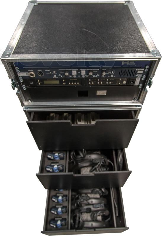 - Up to 40 RS-601 beltpacks or 10 speaker stations or 12 headset stations distributed over both channels