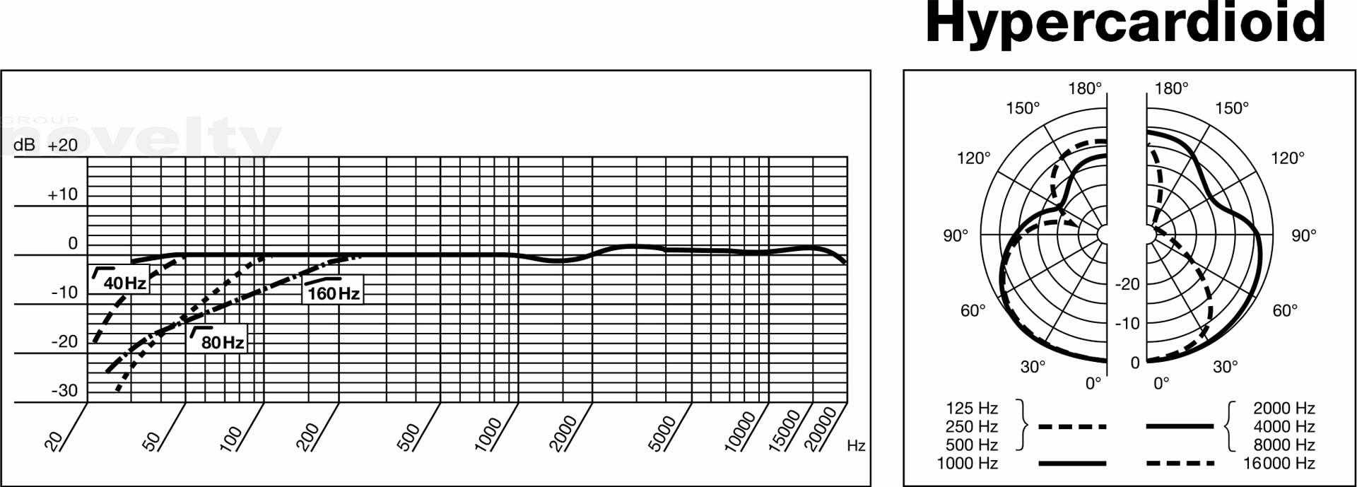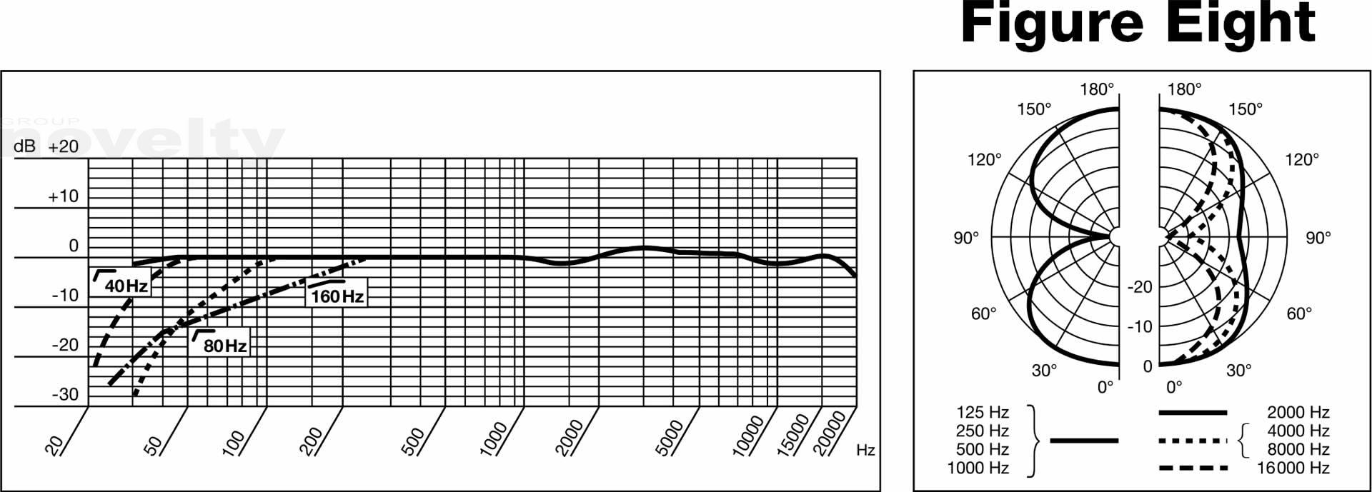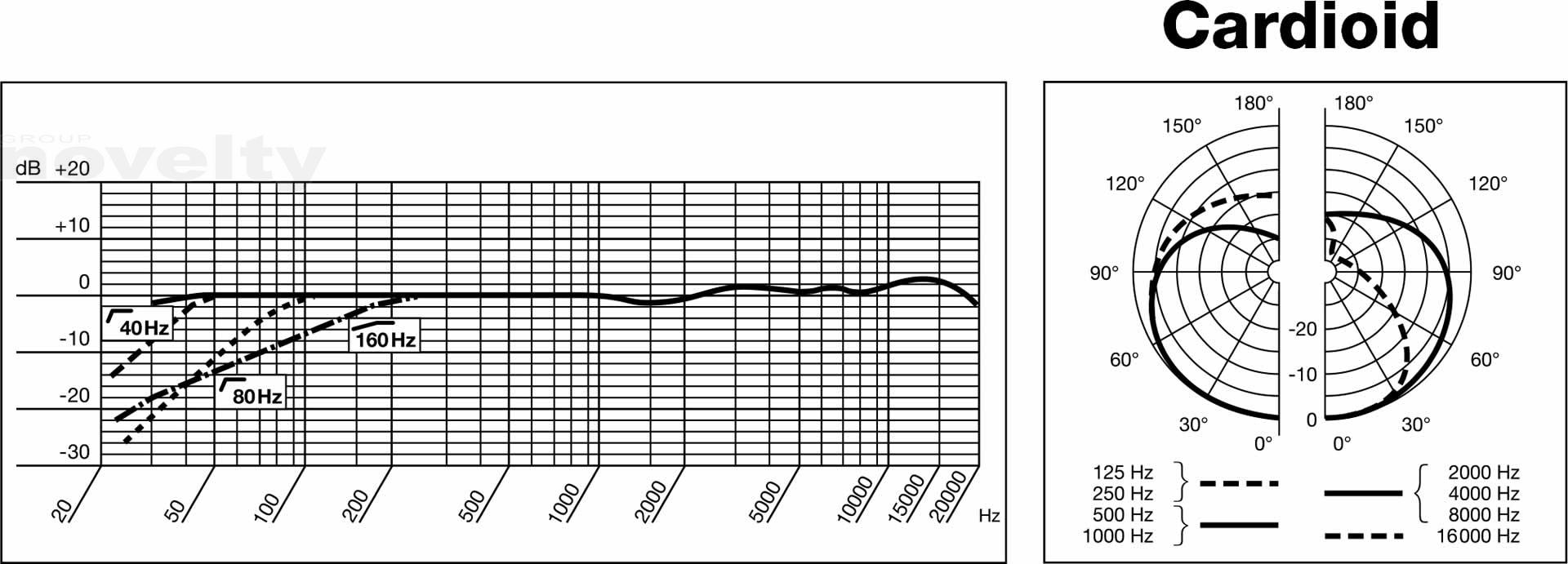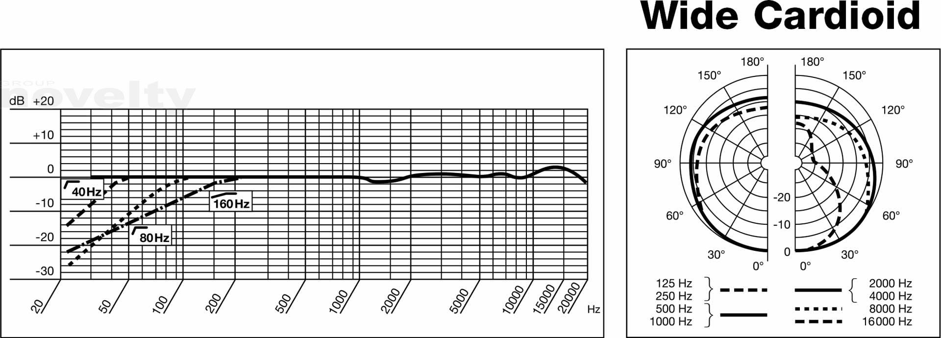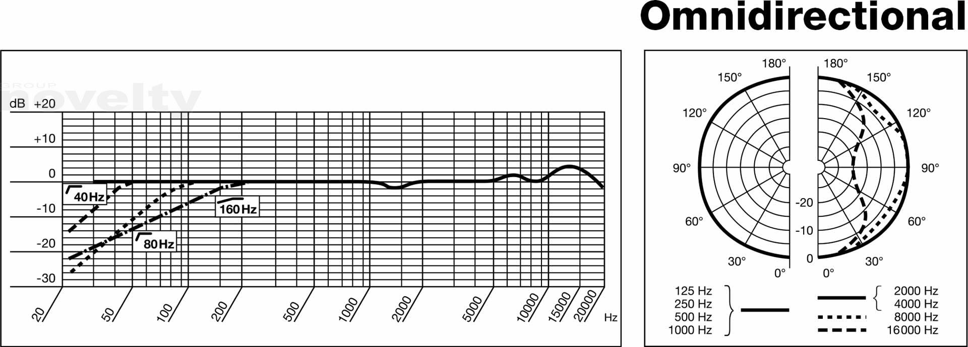 • Polar patterns : Omnidirectional, wide cardioid, cardioid, hypercardioid, figure eight?Sensitivity : 23 mV/Pa (-33 dBV) ± 0.5 dB?Frequency range : 20 to 20,000 Hz (see frequency response traces)?Electrical impedance : ≤ 200 ohms