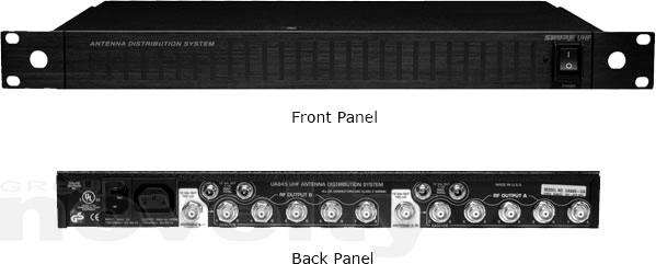 The UA845 UHF Antenna Distribution System is designed for large UHF or UHF-R wireless systems. Each unit allows up to four wireless receivers to use the same two antennas, and the CASCADE ports allow connection to a fifth receiver or a second UA845.
