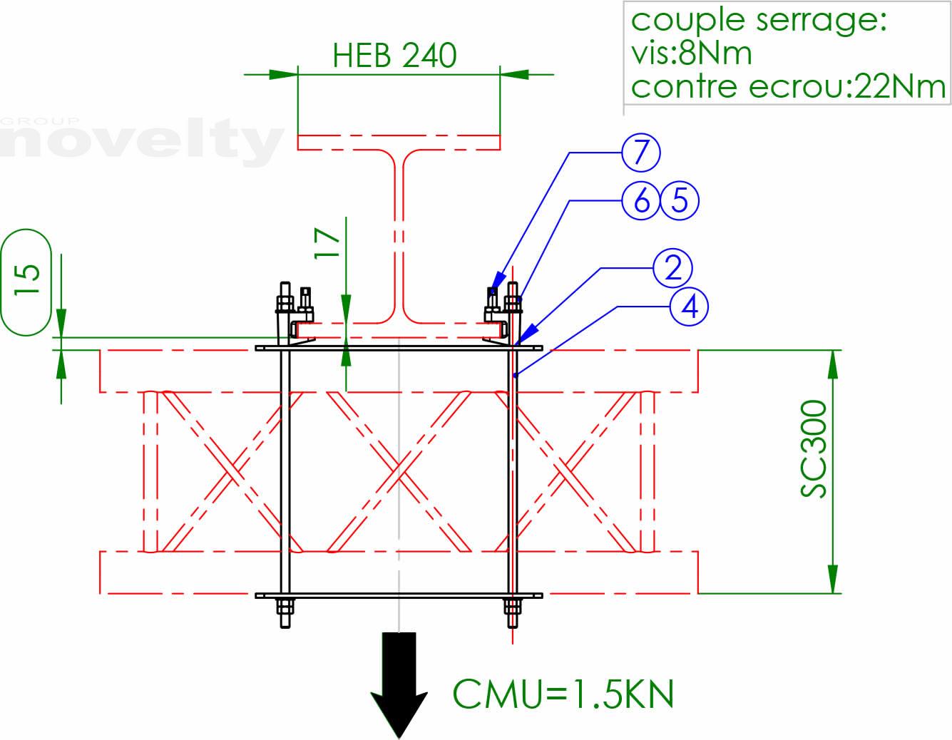 Ensemble d'accroche double pour série 300 carré sur poutre IPN type HEB240, CMU 300kg