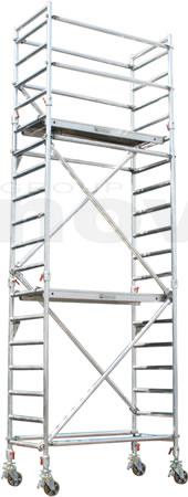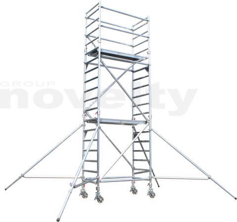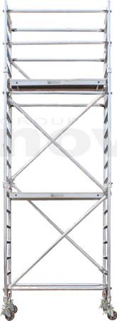 Tour échaffaudage simple largeur, 4m avec escalier, garde-corps et stabilisateurs. Livrée en chariot.