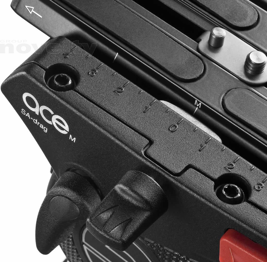 La plage d’inclinaison de la nouvelle tête fluide s’étend de 90° à -75°. Ace est fabriqué en matière plastique renforcée en fibres de verre, offrant à l’opérateur une haptique agréable et bien en mains. En outre, la nouvelle tête fluide de 75 mm est de plus particulièrement légère.