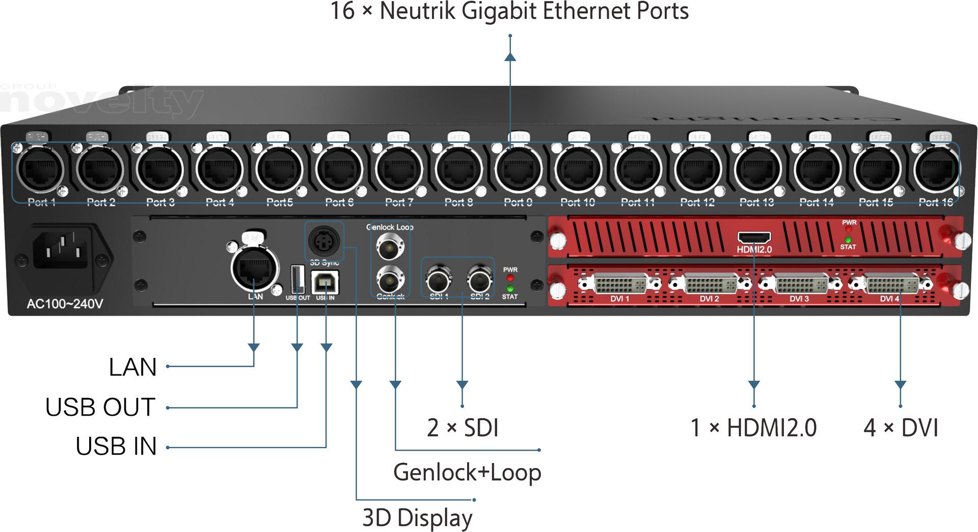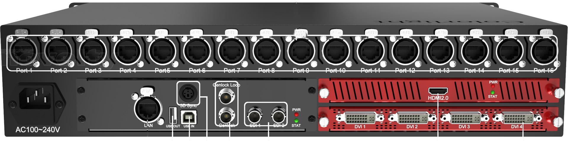 Processeur-controlleur vidéo, résolution jusqu'à 3 840 × 2 160 à 60 Hz, ports d'entrée 2x SDI × 2 + 1x HDMI2.0 + 4x DVI