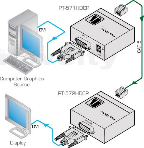 • The PT−571HDCP is a DGKatTM twisted−pair transmitter for DVI signals. The PT−571HDCP converts the DVI to twisted pair signal and the PT−572HDCP+ converts the twisted pair signal back to a DVI signal.