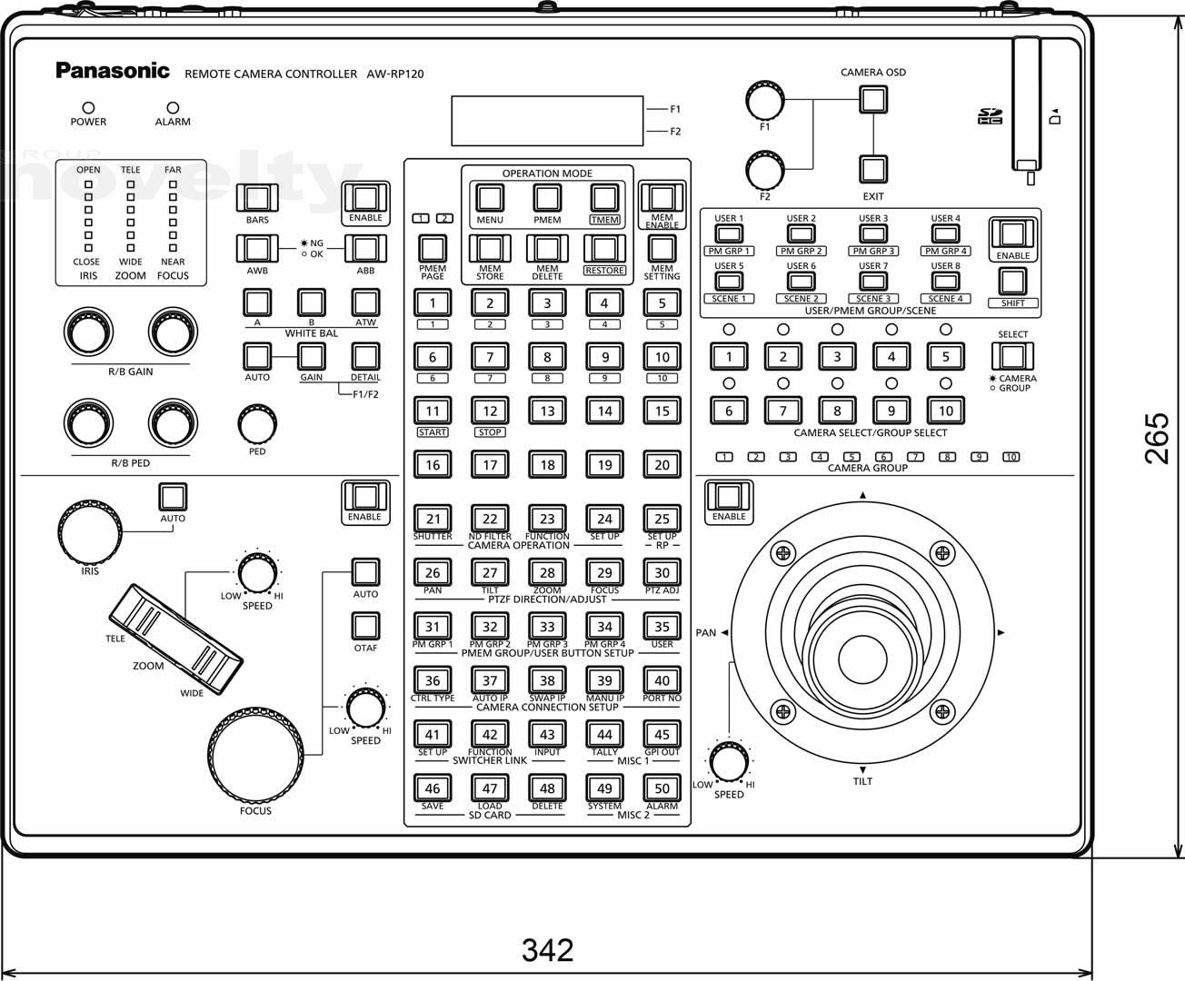 La commande à distance permet un réglage direct du gain d'une caméra, d'obturation, de détail, AWB, ABB, Master piédestal, R / B Socle et R / B Gain. Autres fonctions du menu des appareils Panasonic compatibles peuvent être contrôlés aussi à l'aide du RP120. Son écran LCD facilite l'utilisation du menu ainsi que le zoom dédié, l'affichage de l'indicateur et de l'iris mise au point. Diverses fonctions peuvent également être attribuées à huit boutons utilisateur pour le contrôle d'une seule touche. Les fichiers de scène peuvent être utilisés pour la commutation d'une touche de modes de prise de vue de la caméra à distance, et les paramètres peuvent être stockés sur une carte mémoire SD pour les configurations de sauvegarde et de clonage à d'autres contrôleurs.
