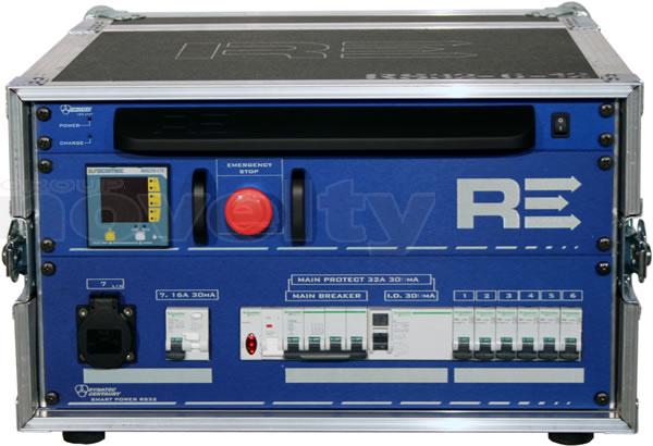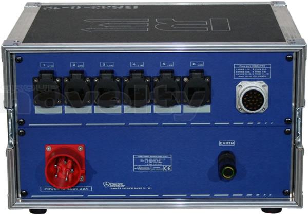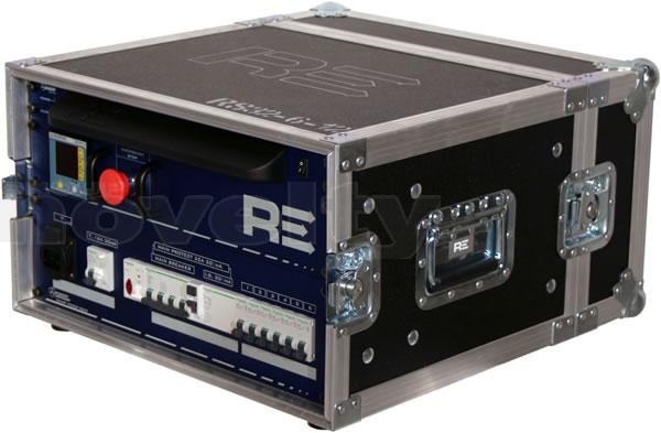 Armoire de distribution en flight-case. Entrée : P17 32A tri. Sorties : 1 x SOCA419 6 circuits + 6 x PC16A. Protection différentielle 30mA