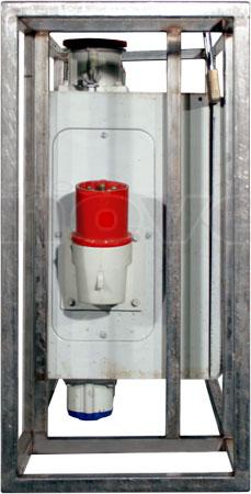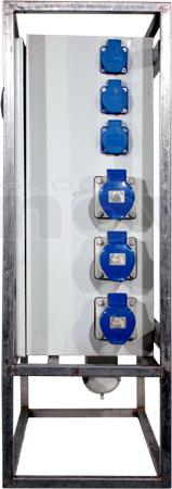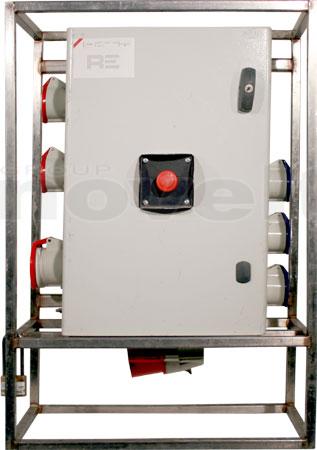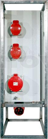 Armoire de distribution sur pied. Entrée : P17 63A tri. Sorties : 2 x P17 32tri + 3 x P17 32mono + 3 x PC16A. Protection différentielle 30mA. Recopie 63tri