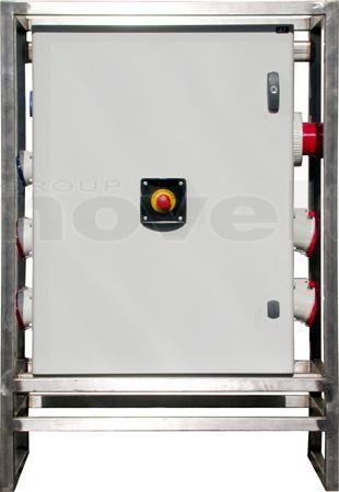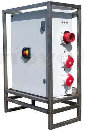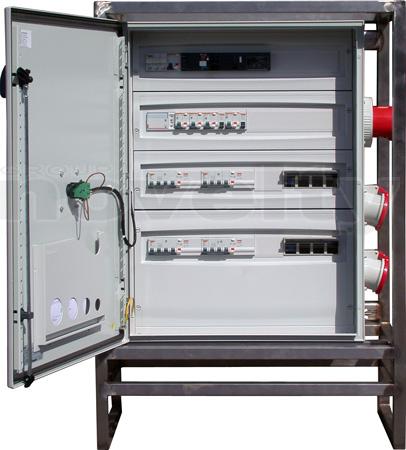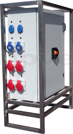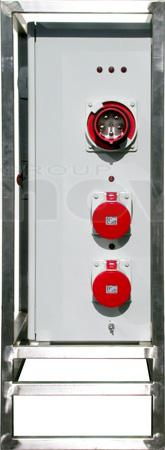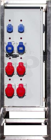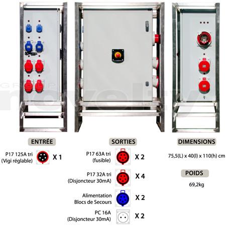 Armoire de distribution sur pied. Entrée : P17 125A tri. Sorties : 2 X P17 63tri + 4 x P17 32tri + 2 x PC16A + 2 alim. Blocs de secours. Protection différentielle 30mA