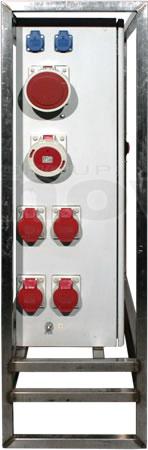 Armoire de distribution sur pied. Entrée : Bornier. Sorties : 2 x P17 125tri + 2 x P17 63tri + 8 x P17 32tri + 2 x PC16A. Protection différentielle 30mA
