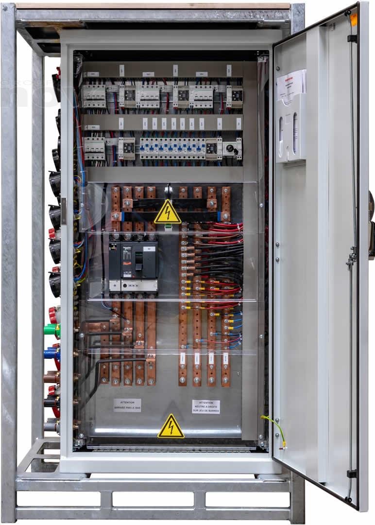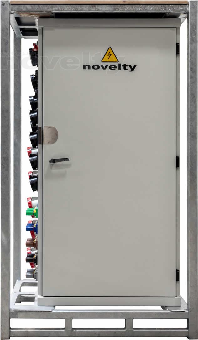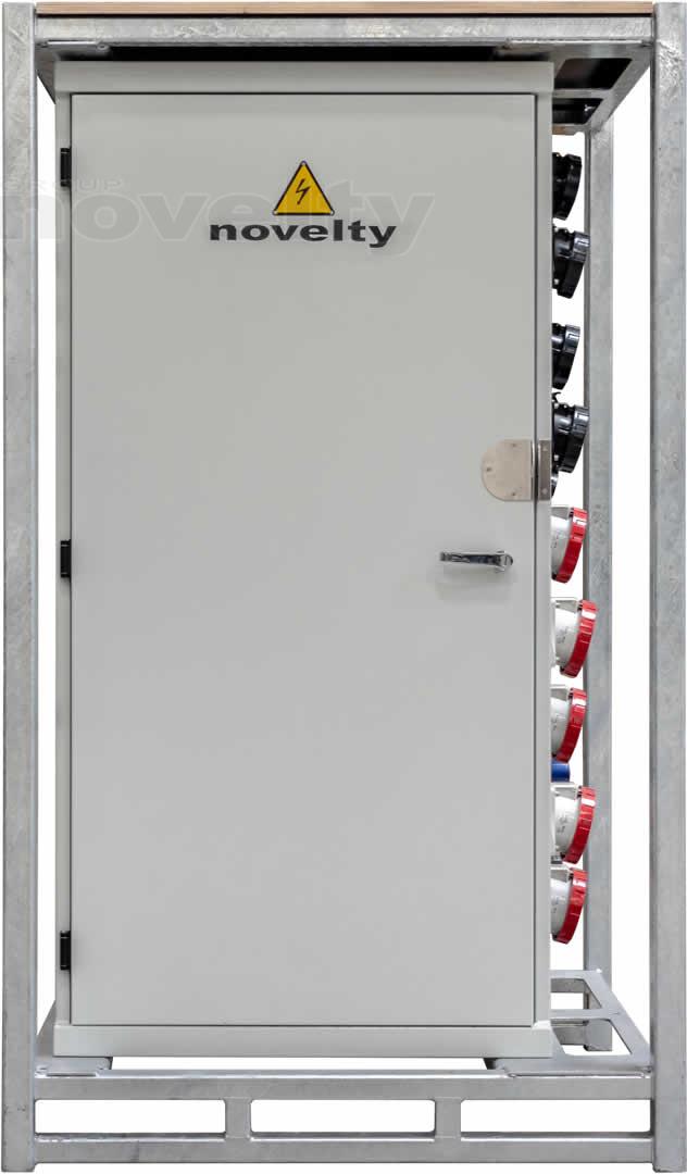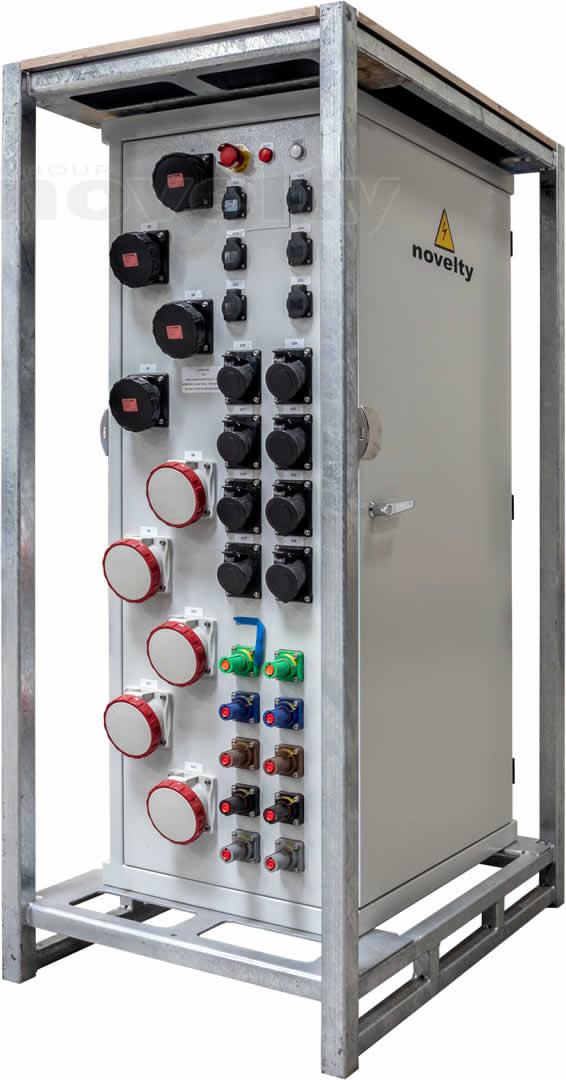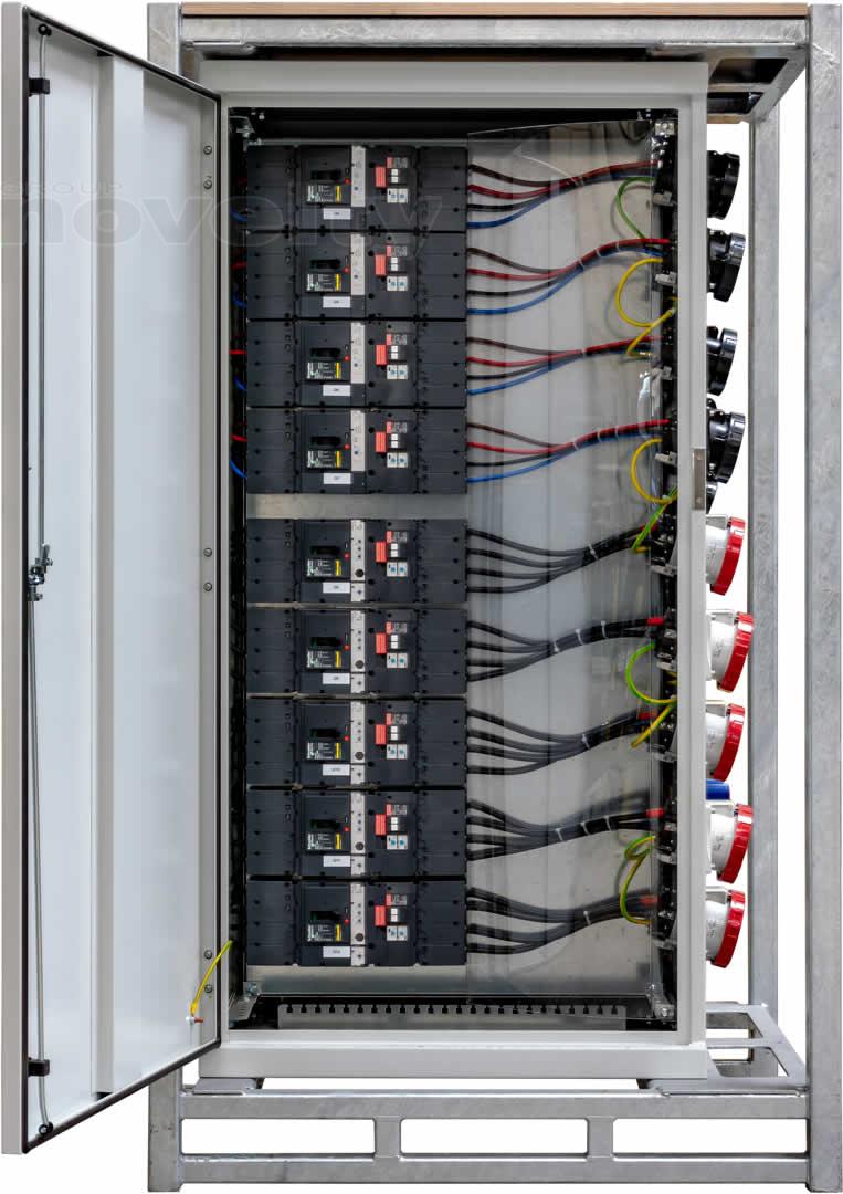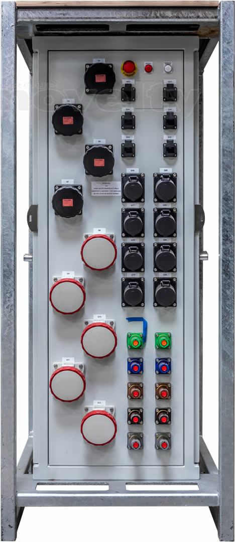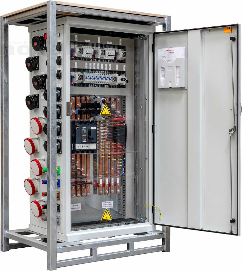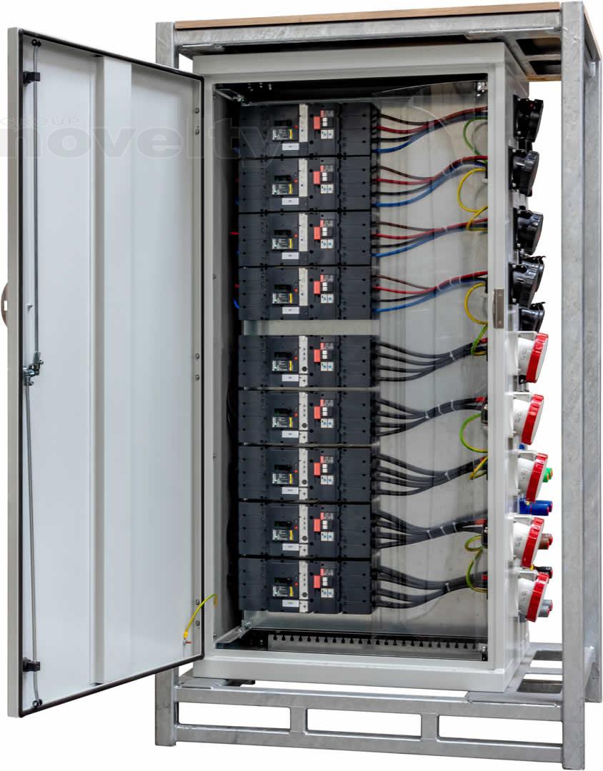 Armoire de distribution extérieure IP44. Entrée : 2 jeux de Powerlock 150 mm2. Sorties : 5 x P17 125tri + 4 x P17 63tri + 4 x P17 32tri + 4 x P17 32mono + 6 x PC16A. Protection différentielle réglable sur chaque départ. Dé-classable en 400A, 250A.