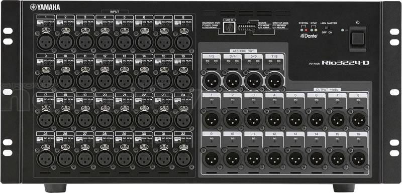 The Yamaha Rio3224-D is a Dante-compatible I/O rack, featuring 32 analog inputs, 16 analog outputs, and 4 Stereo AES/EBU outputs.