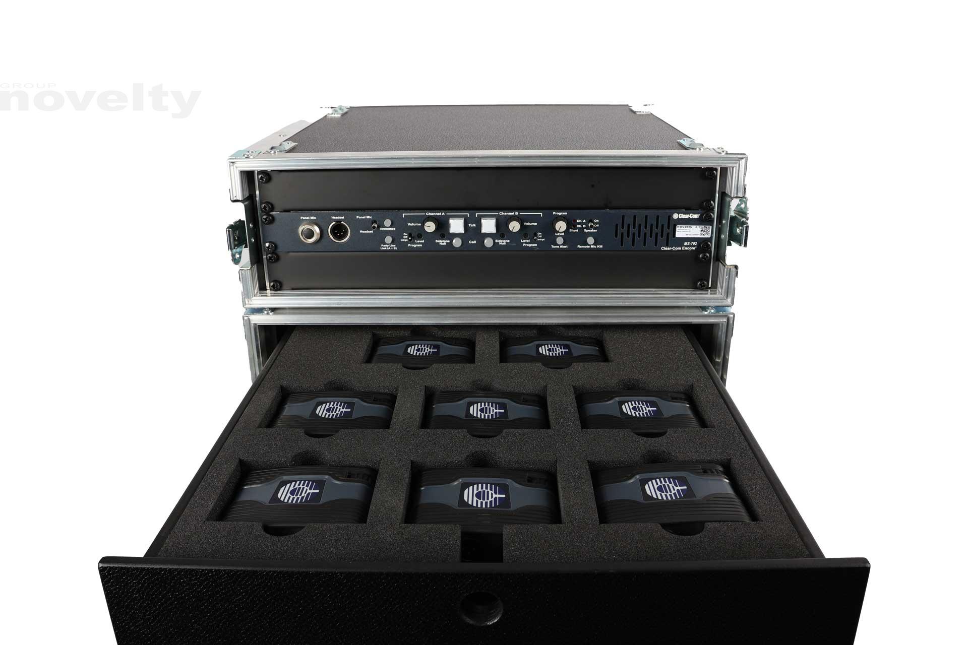 - Up to 40 RS-601 beltpacks or 10 speaker stations or 12 headset stations distributed over both channels
