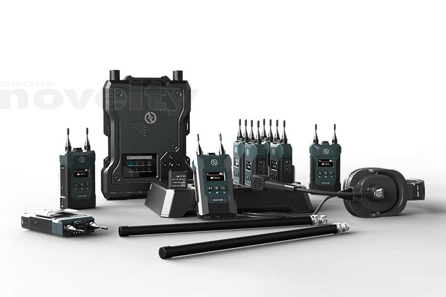 SOLIDCOM M1Ce pack comprend : une base, 4 beltpacks, 3 casques une oreille, 1 casque deux oreilles, station de charge, 2 antennes omnidirectionnelles à gain élevé, adaptateur PoE, câble RJ45 vers XLR, câbles USB Type-A vers USB Type-C, adaptateur XLR4 et 8 batteries.