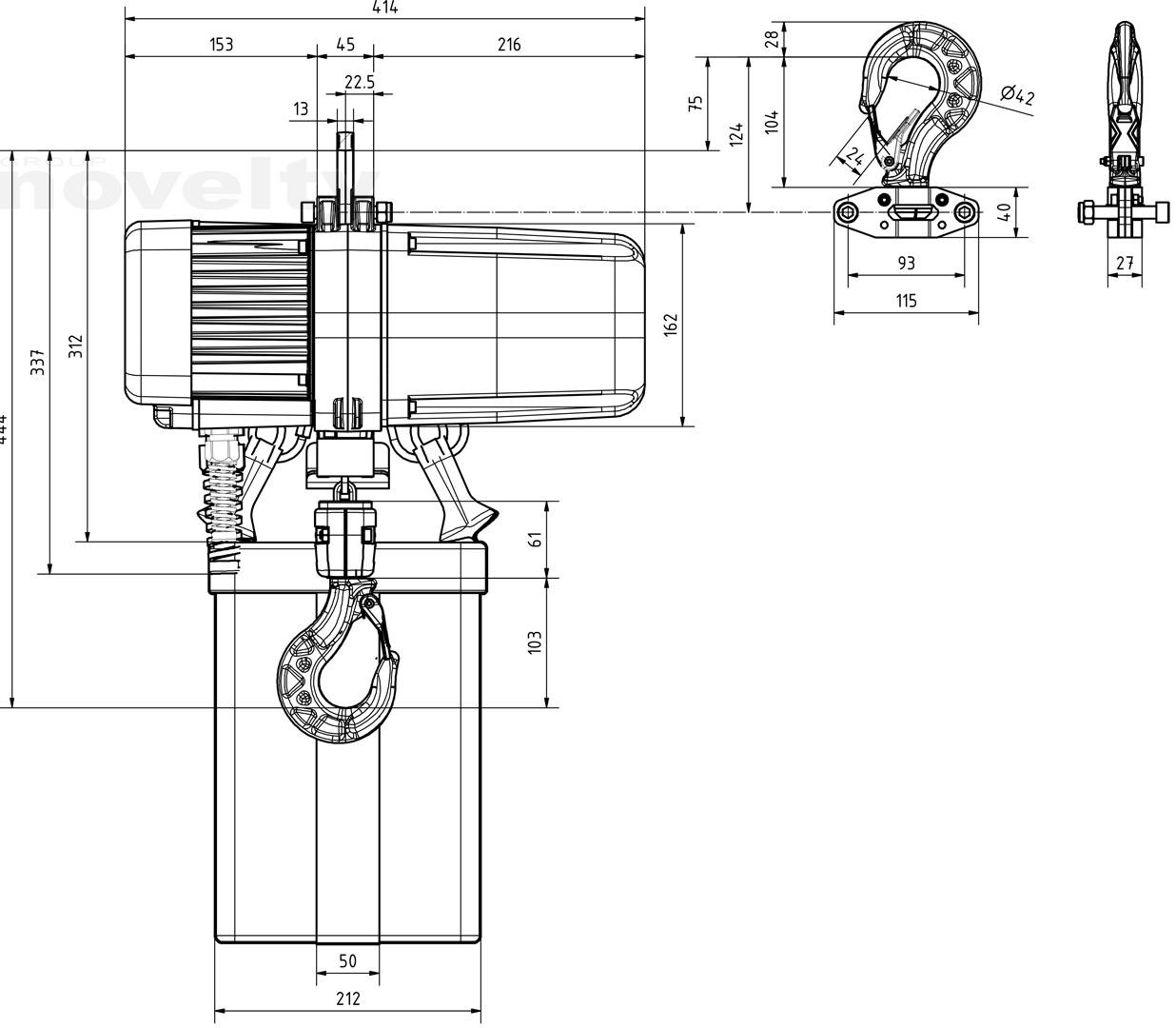 - Puissance du moteur : 0.55 kW en version 4m/min ou 0.72 kW en version 8m/min