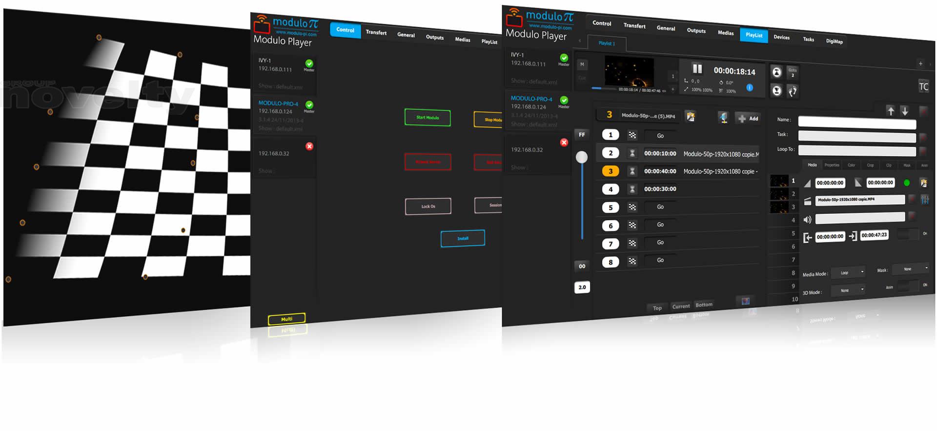 Modulo Player est un média serveur vidéo. L’application, qui repose entièrement sur un moteur développé en interne, est le fruit de 15 années d’expérience dans les technologies de pointe de la projection vidéo et de conception logicielle. Grâce à une interface moderne et intuitive, Modulo Player vous permet de gérer facilement vos projets quelle qu’en soit la complexité.